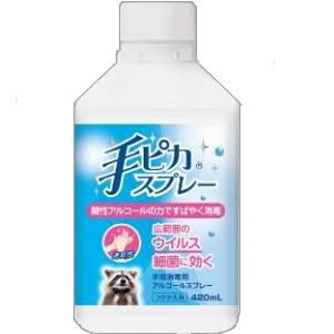 手ピカスプレー」は、酸性アルコールの力で消毒効果がアップした液体タイプの消毒用アルコールです。グリセリン、アラントインなど(保湿成分、添加物)を配合しているので手荒れしにくく、液体タイプなのでサラっとした使い心地です。