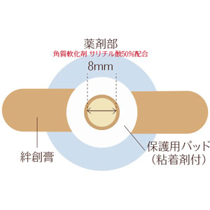 薬剤部に粘着性があるので、患部に密着して有効成分サリチル酸の浸透効果を高めます。