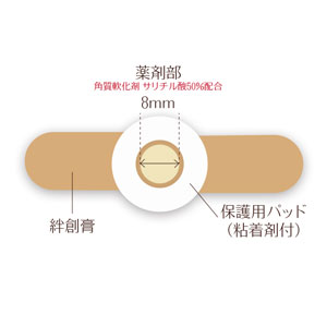 - 被覆してある剥離紙をはぎ取り、中央部のサリチル酸絆創膏が患部を覆うように貼り付けます。