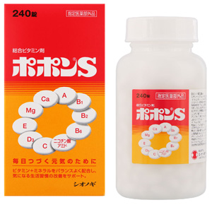 ポポンSは、健康の維持増進、栄養補給に必要な8種類のビタミンとカルシウム、マグネシウムをバランスよく配合した保健剤で、特にビタミンB1には吸収の優れたセトチアミン塩酸塩水和物、ビタミンEには生理活性の高い天然型ビタミンEを含有しています。