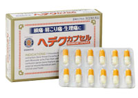 ヘデクカプセルは,頭痛・肩こり痛・生理痛などによる痛みや発熱に優れた効果を発揮するアスピリン,アセトアミノフェン,カフェインを配合した服用しやすい鎮痛解熱薬です。また,胃粘膜保護剤を配合していますので胃にやさしいお薬です。